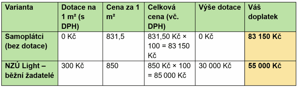 - Samoplátce: bez dotace → doplatek = 83 150 Kč