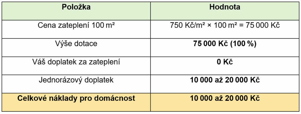 Výpočet je založen na reálných cenách za foukanou izolaci (30 cm vrstva) podle typu žadatele a zahrnuje i pravidla dotačního programu Nová zelená úsporám Light. Ukázková plocha je 100 m².